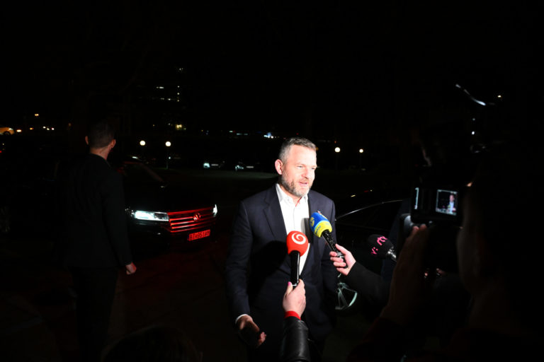Kandidát na prezidenta SR a predseda strany HLAS - sociálna demokracia Peter Pellegrini príchodu do reštaurácie Aušpic počas volebnej noci v rámci 1. kola prezidentských volieb 2024. Bratislava, 23. marec 2024. Foto: SITA/Martin Medňanský.