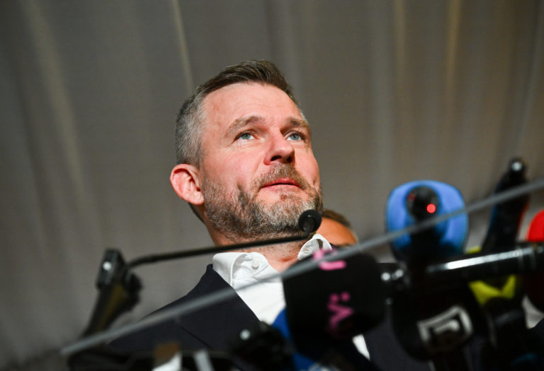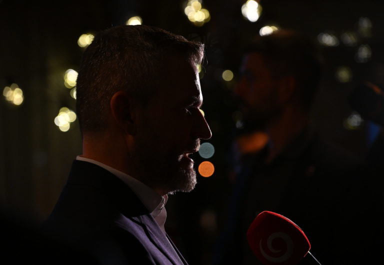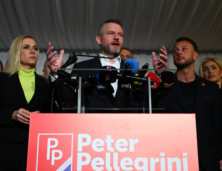 Kandidát na prezidenta SR a predseda strany HLAS - sociálna demokracia Peter Pellegrini (vľavo) počas tlačového brífingu v rámci volebnej noci kandidáta na prezidenta SR a predsedu strany HLAS - sociálna demokracia Petra Pellegriniho v reštaurácii Aušpic pri príležitosti 1. kola prezidentských volieb 2024. Bratislava, 24. marec 2024. Foto: archívne, SITA/Martin Medňanský