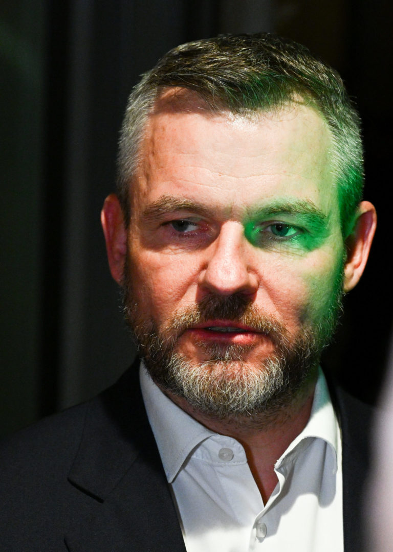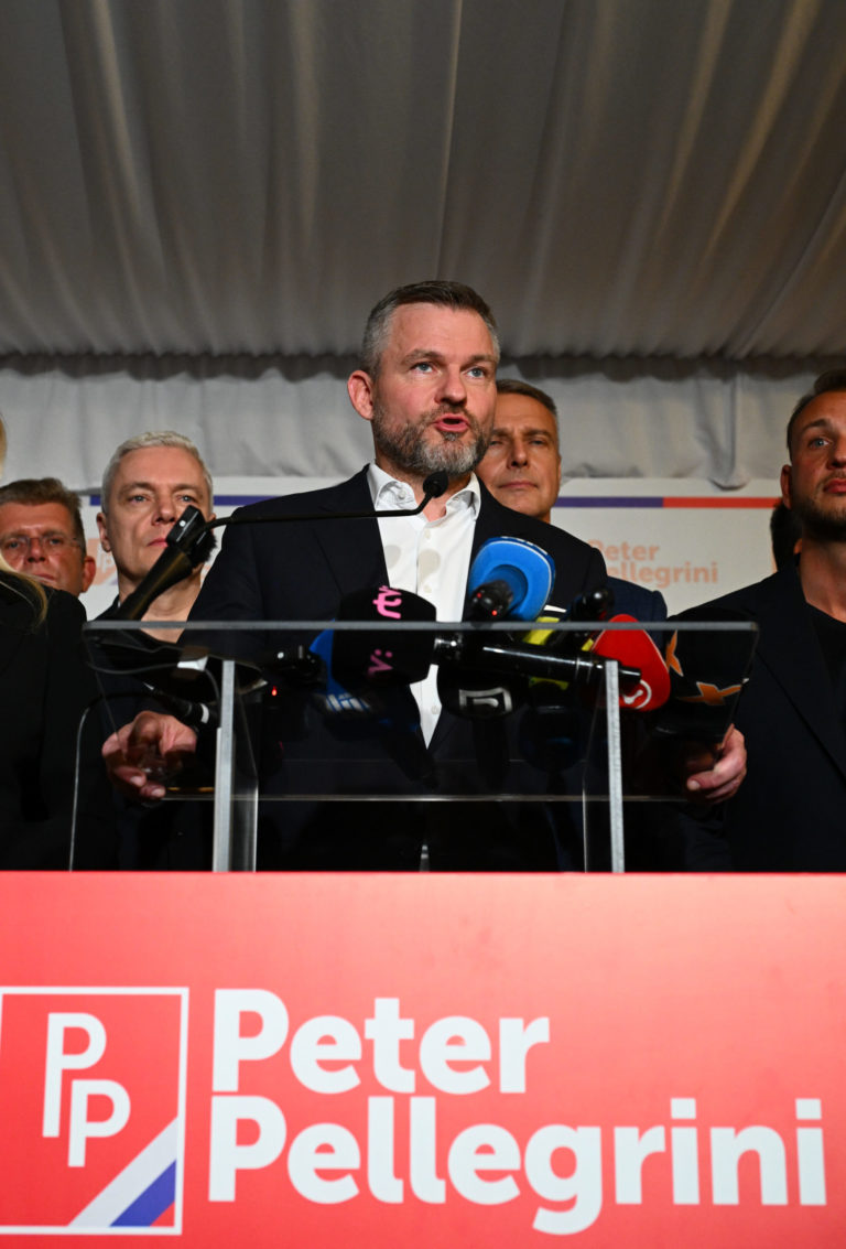 Kandidát na prezidenta SR a predseda strany HLAS - sociálna demokracia Peter Pellegrini (v poredí) počas tlačového brífingu v rámci volebnej noci v reštaurácii Aušpic pri príležitosti 1. kola prezidentských volieb 2024. Bratislava, 24. marec 2024. Foto: SITA/Martin Medňanský