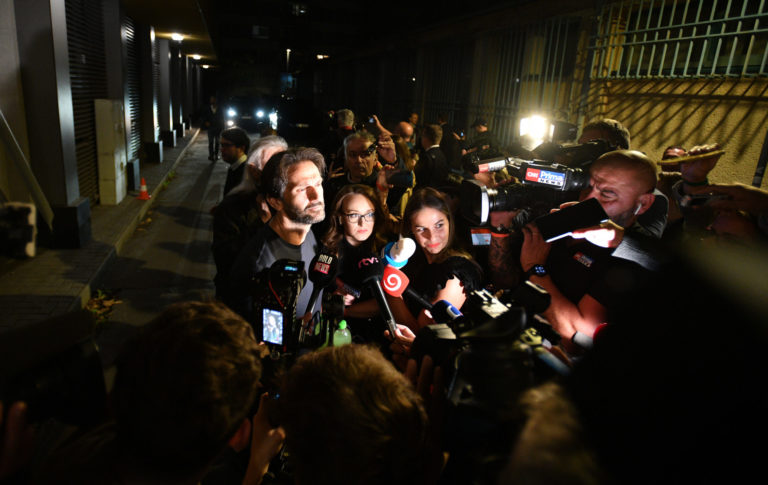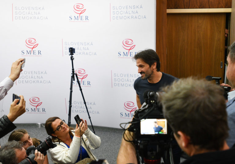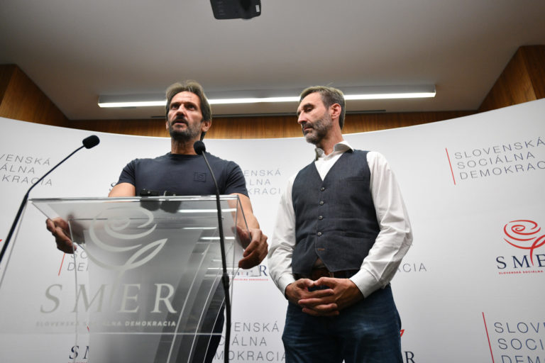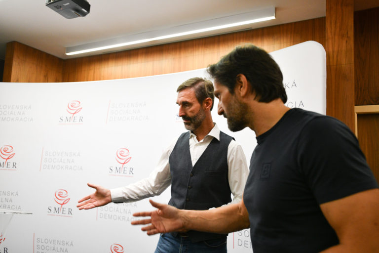 Kandidát na poslanca za stranu Smer-SSD Tibor Gašpar (vpravo) počas príchodu na volebnú noc do centrály strany SMER – slovenská sociálna demokracia (SMER-SSD) v rámci predčasných volieb do Národnej rady SR 2023. Bratislava, 30. september 2023. Foto: SITA/Martin Medňanský