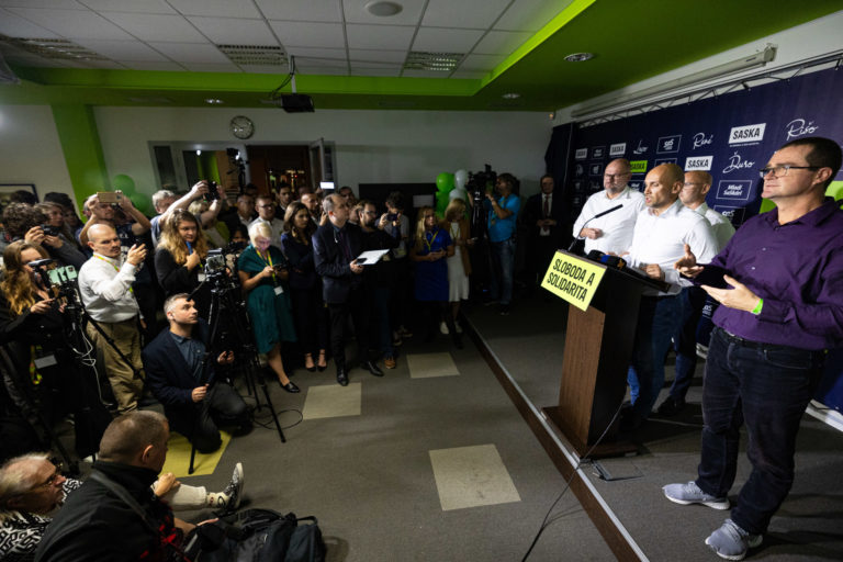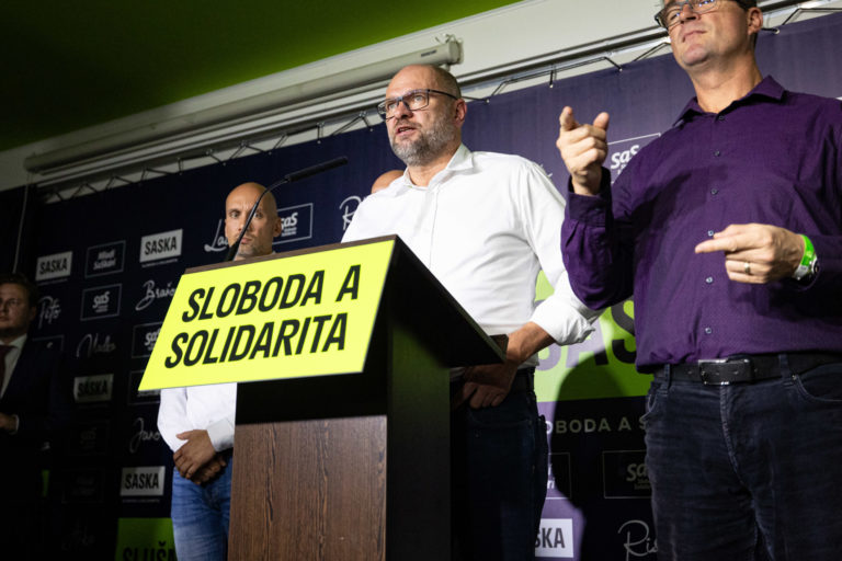 Predseda SaS Richard Sulík (uprostred) počas volebnej noci v centrále strany Sloboda a Solidarita (SaS) v rámci predčasných volieb do Národnej rady SR 2023. Bratislava, 30. september 2023. Foto: SITA/Jana Birošová