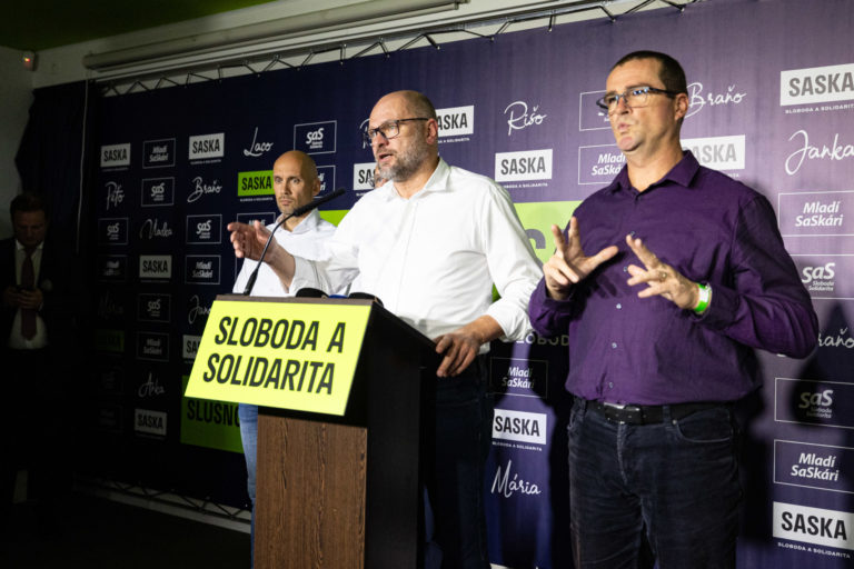 Predseda SaS Richard Sulík (vpravo) počas volebnej noci v centrále strany Sloboda a Solidarita (SaS) v rámci predčasných volieb do Národnej rady SR 2023. Bratislava, 30. september 2023. Foto: SITA/Jana Birošová