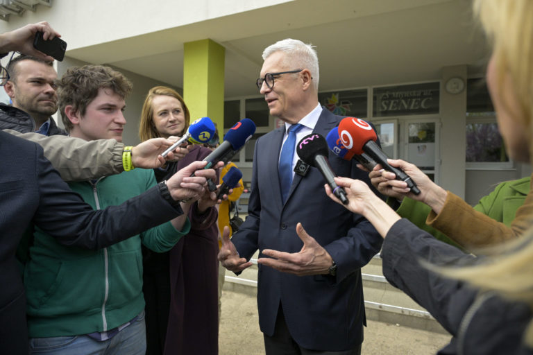 Občiansky kandidát na prezidenta SR Ivan Korčok (vpravo) počas brífingu po volebnom akte v rámci 1. kola prezidentských volieb 2024. Senec, 23. marec 2024. Foto: SITA/Milan Illík.