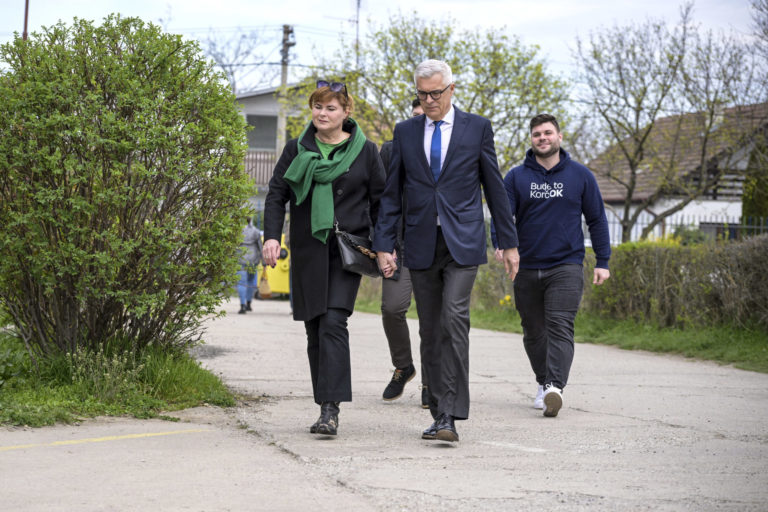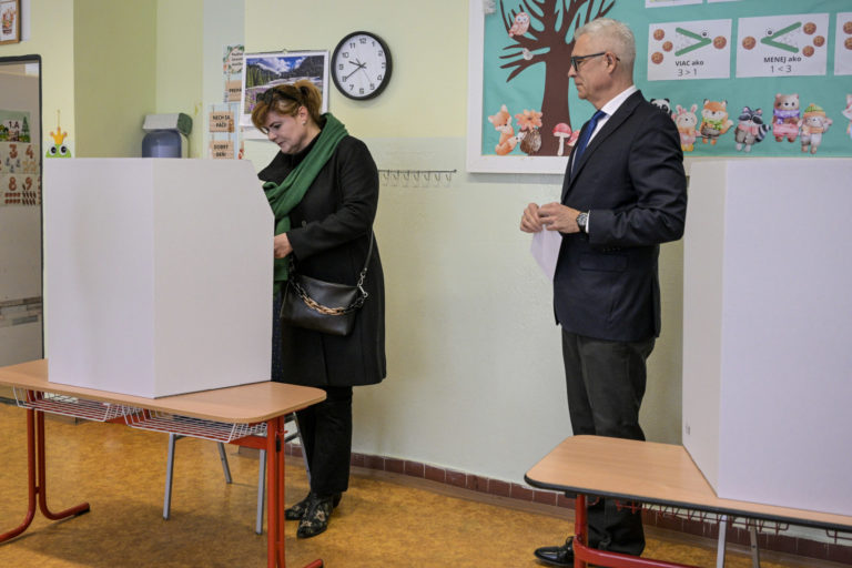 Sprava: Občiansky kandidát na prezidenta SR Ivan Korčok s manželkou počas volebného aktu v rámci 1. kola prezidentských volieb 2024. Senec, 23. marec 2024. Foto: SITA/Milan Illík.