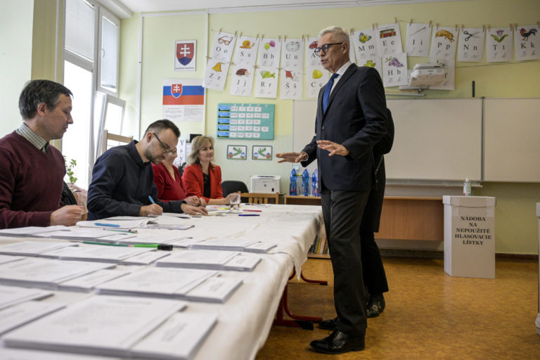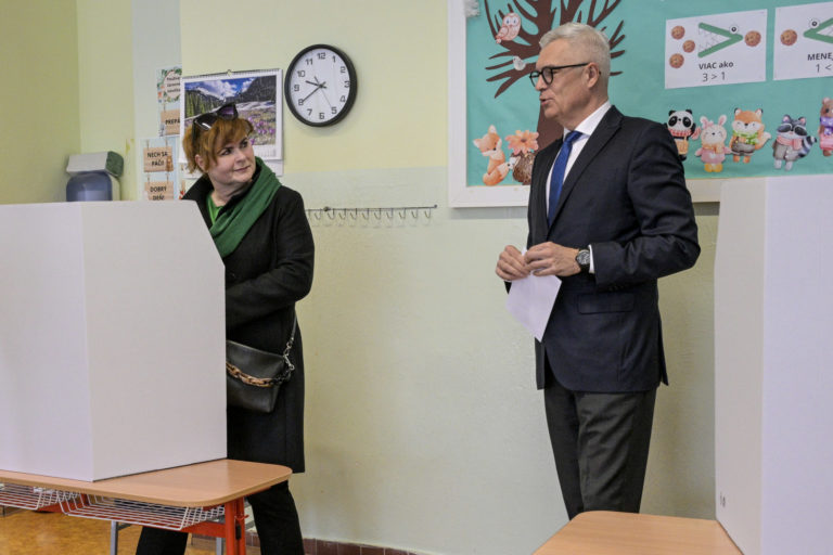 Občiansky kandidát na prezidenta SR Ivan Korčok (vpravo) vo volebnej miestnosti pred volebným aktom v rámci 1. kola prezidentských volieb 2024. Senec, 23. marec 2024. Foto: SITA/Milan Illík.