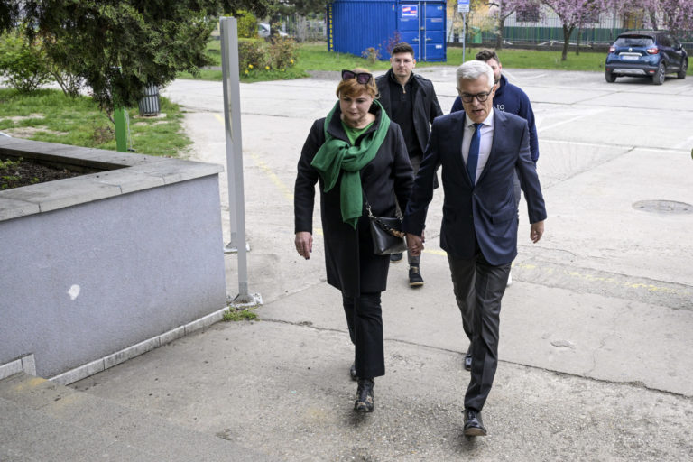 Občiansky kandidát na prezidenta SR Ivan Korčok s manželkou vstupuje do volebnej miestnosti pred volebným aktom v rámci 1. kola prezidentských volieb 2024. Senec, 23. marec 2024. Foto: SITA/Milan Illík.