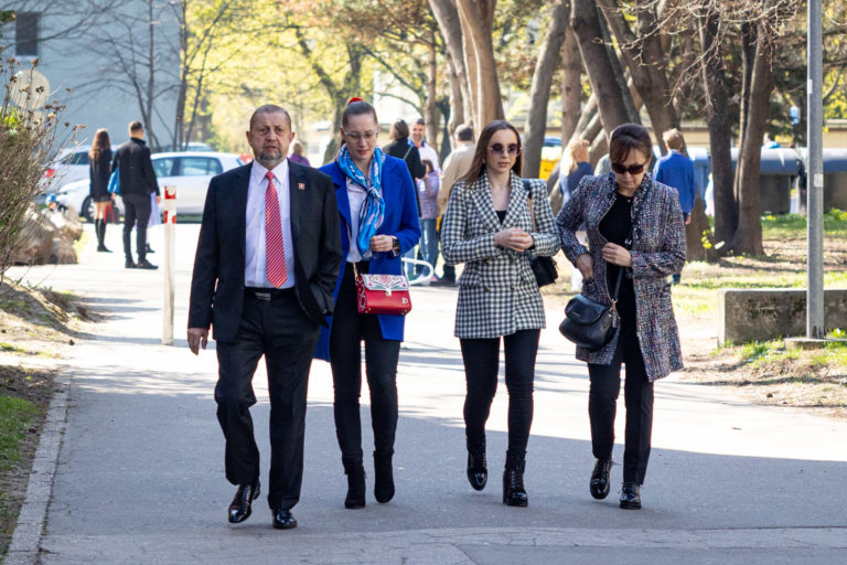Občiansky kandidát na prezidenta SR Štefan Harabin (v poppredí vpravo) s rodinou prichádza do volebnej miestnosti v rámci 1. kola prezidentských volieb 2024. Bratislava, 23. marec 2024. Foto: SITA/Jana Birošová