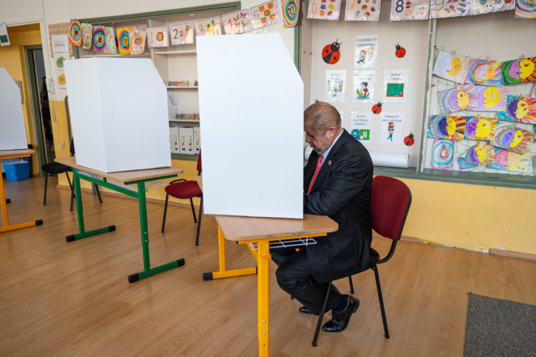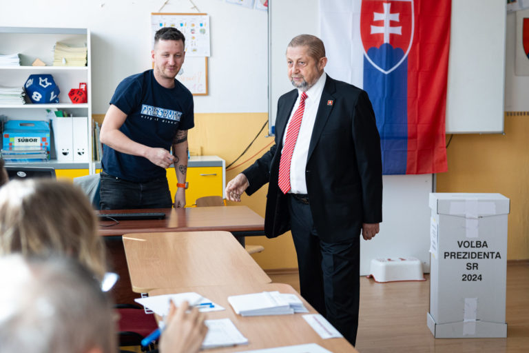 Občiansky kandidát na prezidenta SR Štefan Harabin (vpravo) počas volebného aktu v rámci 1. kola prezidentských volieb 2024. Bratislava, 23. marec 2024. Foto: SITA/Jana Birošová