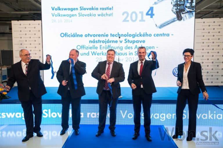 Sprava: Riaditeľka nástrojárne Brita Neubus, predseda predstavenstva spoločnosti Volkswagen Slovakia Albrecht Reimold, riaditeľ kancelárie ministra hospodárstva SR Bruno Hromý, primátor Stupavy Pavel Slezák a vedúci technologickej časti nástrojárne Dirk Paustat počas otvorenia technologického centra - nástrojárne spoločnosti Volkswagen Slovensko v Stupave. Stupava, 28. október 2014. Foto: SITA/Jozef Jakubčo
