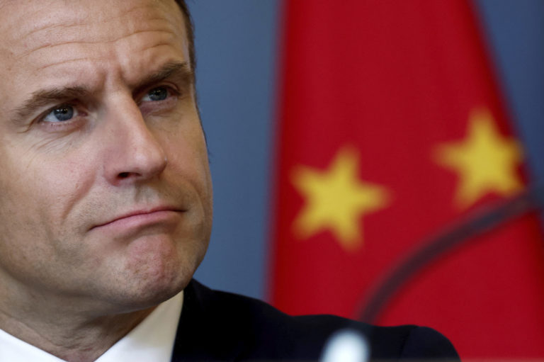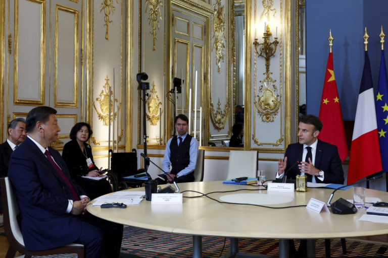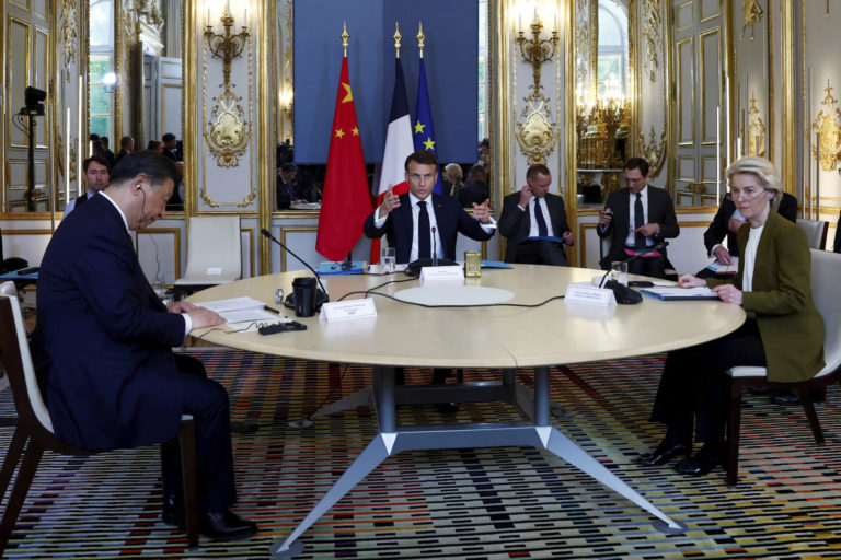 Francúzsky prezident Emmanuel Macron sa zúčastňuje na trojstrannom stretnutí s čínskym prezidentom Si Ťin-pchingom a predsedníčkou Európskej komisie Ursulou von der Leyenovou v Elyzejskom paláci v rámci dvojdňovej štátnej návštevy čínskeho prezidenta vo Francúzsku v pondelok 6. mája 2024 v Paríži. Foto: Gonzalo Fuentes/Pool via AP