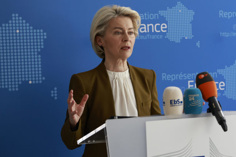 Predsedníčka Európskej komisie Ursula von der Leyenová prednáša svoj prejav po stretnutí s francúzskym prezidentom Emmanuelom Macronom a čínskym prezidentom Si Ťin-pchingom v pondelok 6. mája 2024 v Paríži. Foto: SITA/AP
