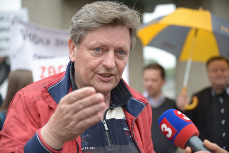 Poslanec mestskej časti Vrakuňa Milan Šindler počas protestu proti nebezpečnej skládke na námestí Ľudovíta Štúra pred Ministerstvom životného prostredia SR v Bratislave. Bratislava, 3. máj 2017. Foto: SITA/Jakub Julény