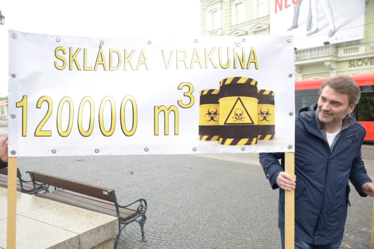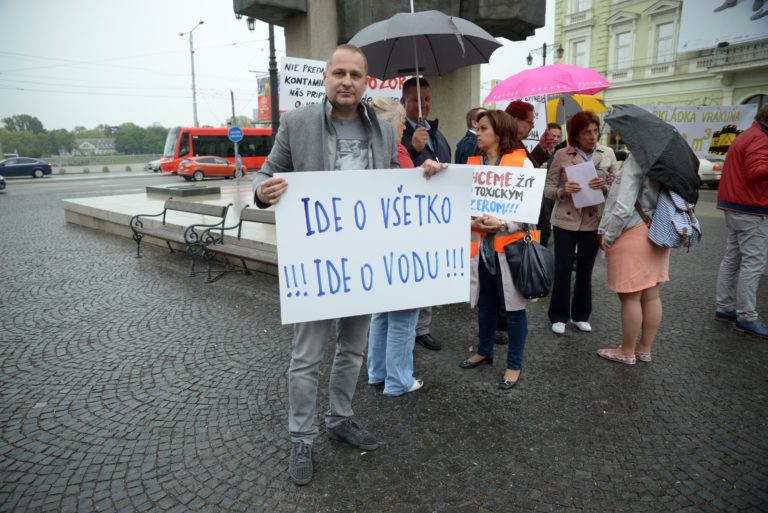 Starosta Vrakune Martin Kuruc (vľavo) počas protestu proti nebezpečnej skládke na námestí Ľudovíta Štúra pred Ministerstvom životného prostredia SR v Bratislave. Bratislava, 3. máj 2017. Foto: SITA/Jakub Julény