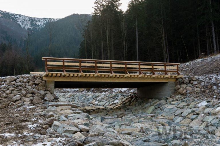 Novovybudované koryto rieky Varínka a premostenie pri údolnej stanici lanovky vo Vrátnej doline. Terchová, 11. december 2014. Foto: SITA/Milo Fabian