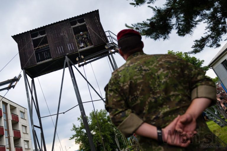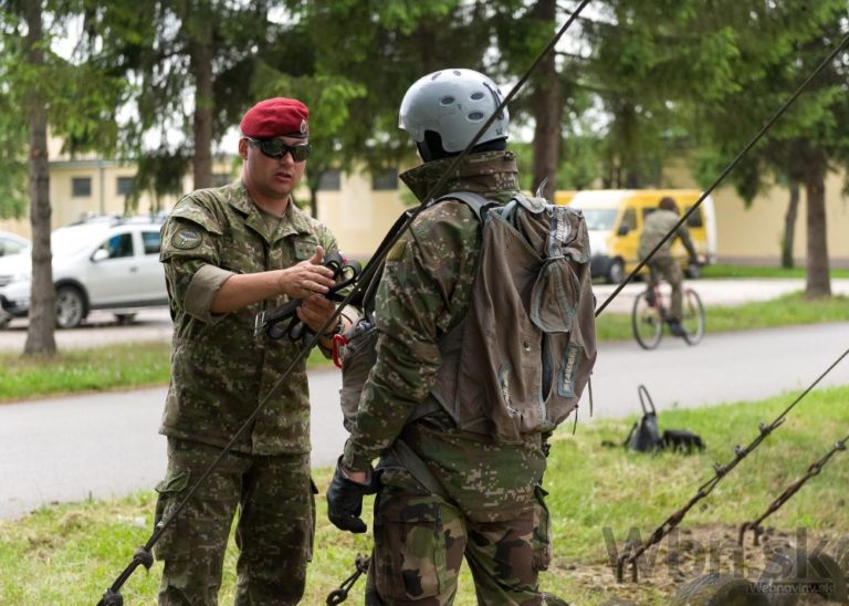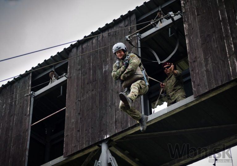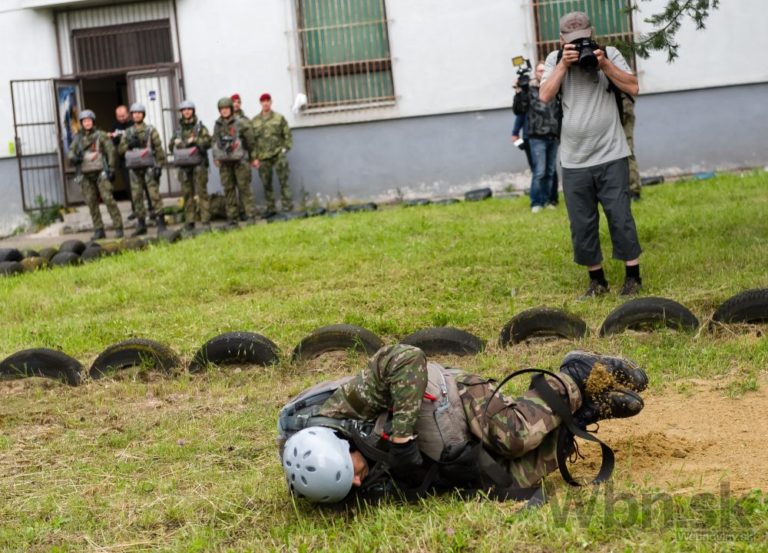 Inštruktor dohliada na adepta na službu v 5. pluku špeciálneho určenia počas ukážky zoskoku v rámci výberu adeptov pre službu v 5. pluku. Foto: SITA/Milo Fabian