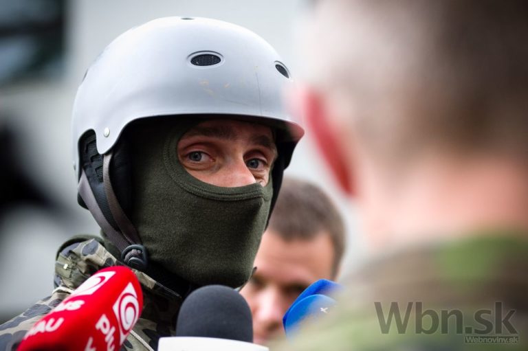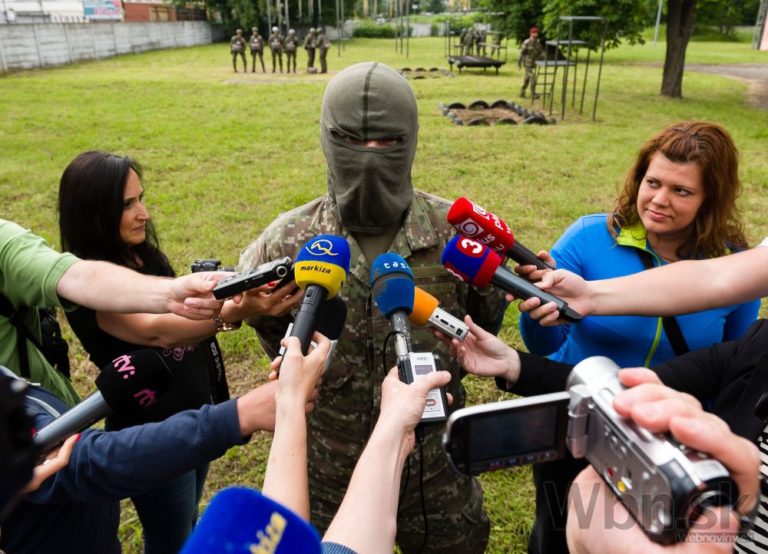 Inštruktor 5. pluku špeciálneho určenia odpovedá na otázky novinárov počas výberu adeptov pre službu v 5. pluku. Žilina, 5. jún 2014. Foto: SITA/Milo Fabian