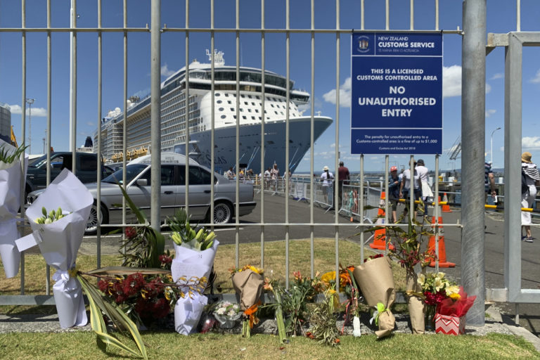 Kvety pred výletnou loďou Ovation of the Seas po výbuchu sopky na Novom Zélande. Tauranga, 10. december 2019. Foto: SITA/AP