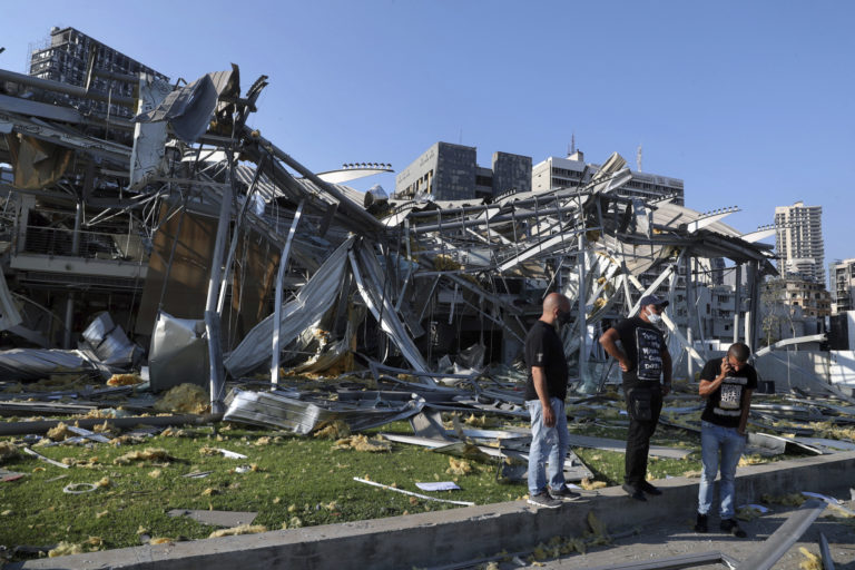 Muži sa pozerajú na katastrofu, ktorú po sebe zanechal mohutný výbuch v bejrútskom prístave. Foto: SITA/AP