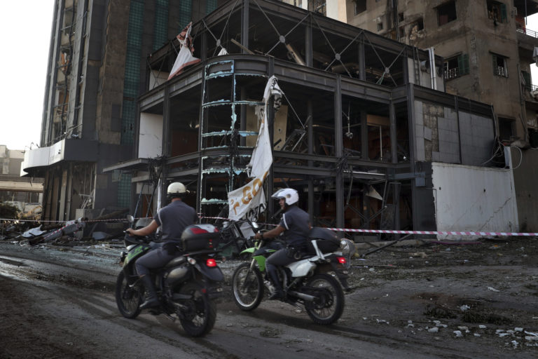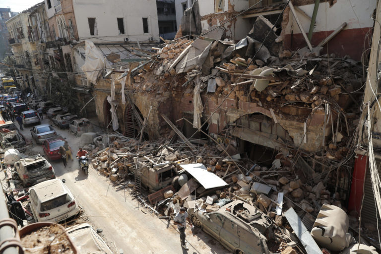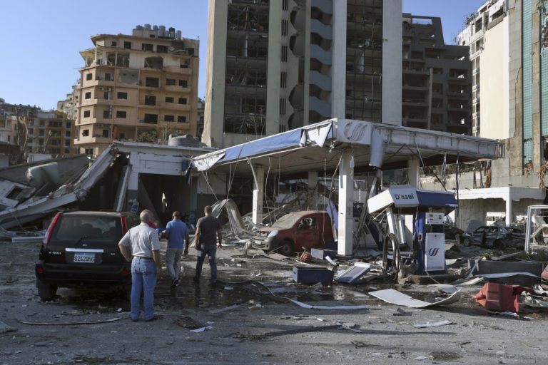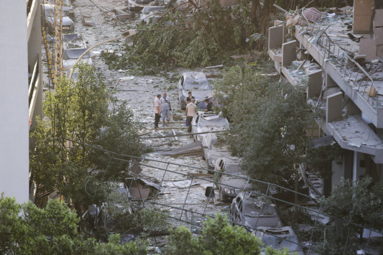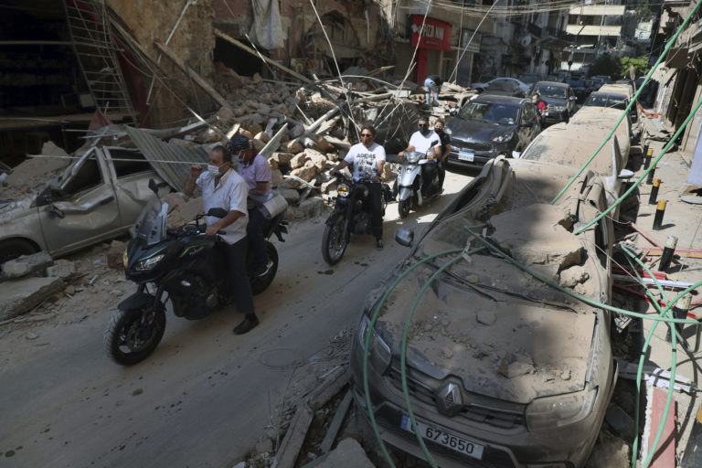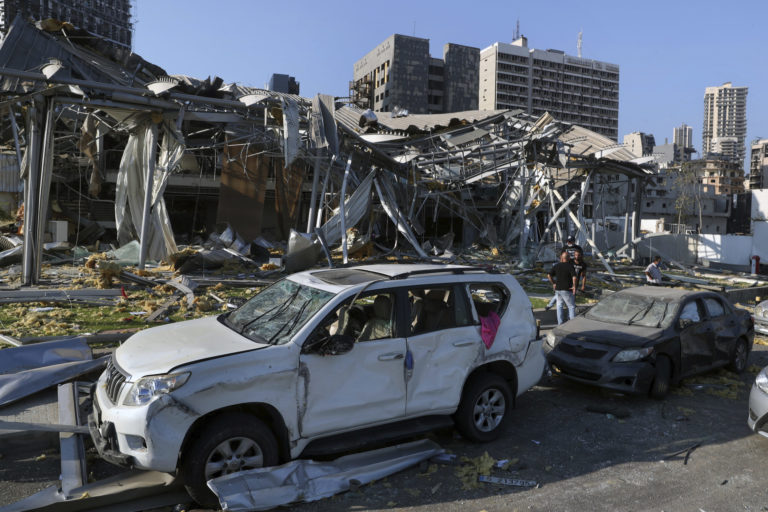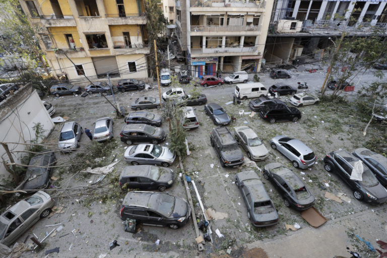 Cars line on one of the damaged roads a day after a massive explosion hit the seaport of Beirut, Lebanon, Wednesday, Aug. 5, 2020. Residents of Beirut awoke to a scene of utter devastation on Wednesday, a day after a massive explosion at the port sent shock waves across the Lebanese capital, killing at least 100 people and wounding thousands. (AP Photo/Hussein Malla)