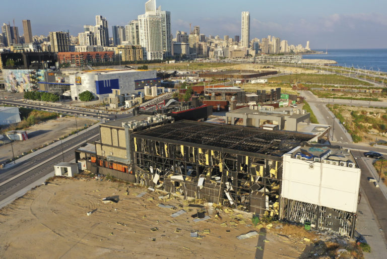 Pohľad na zničený prístav a po výbuchu zdevastované silo. Bejrút 4.8.2020 Foto: SITA/AP