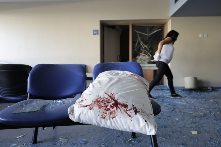 Mohutný výbuch zničil všetko čo mu prišlo do cesty, tlaková vlna vybila okná a zničila alebo poškodila mnohé budovy v okolí, medzi nimi i nemocnicu. Bejrút, 4.8.2020 Foto: SITA/AP