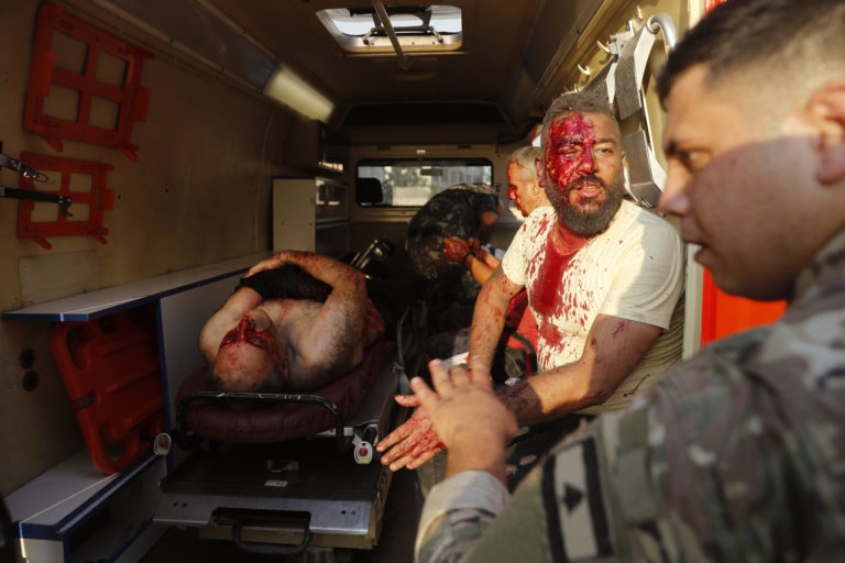 Vojak libanonskej armády kontroluje zranených v sanitke. Bejrút 4.8.2020 Foto: SITA/AP