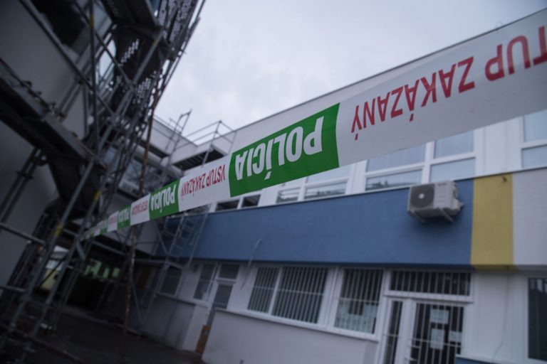 Pohľad na časť budovy zdravotného strediska na Bebravskej ulici a policajnú pásku po výbuchu, ktorý dnes okolo 05:00 poškodil budovu v bratislavskej Vrakuni. Bratislava, 23. júl 2018. Foto: SITA/Branislav Bibel