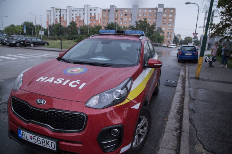 Vozidlo hasičov pred zdravotným strediskom na Bebravskej ulici po výbuchu, ktorý dnes okolo 05:00 poškodil prevádzku pedikúry v bratislavskej Vrakuni. Bratislava, 23. júl 2018. Foto: SITA/Branislav Bibel