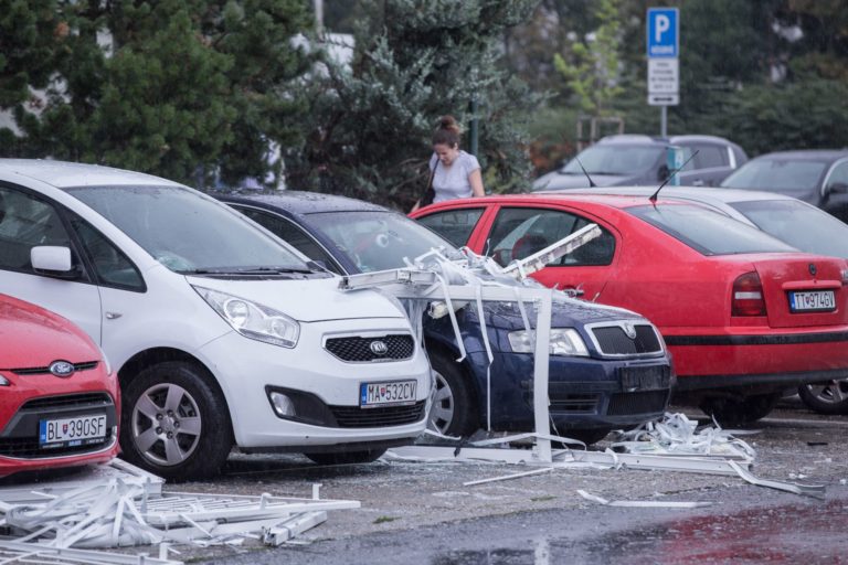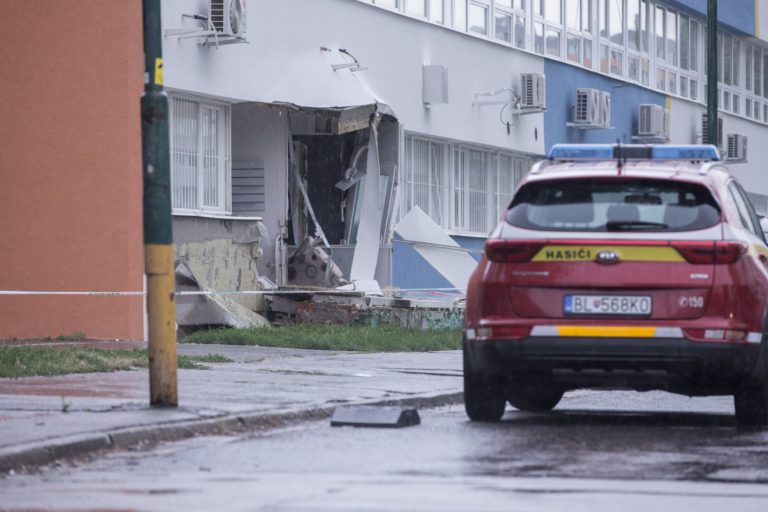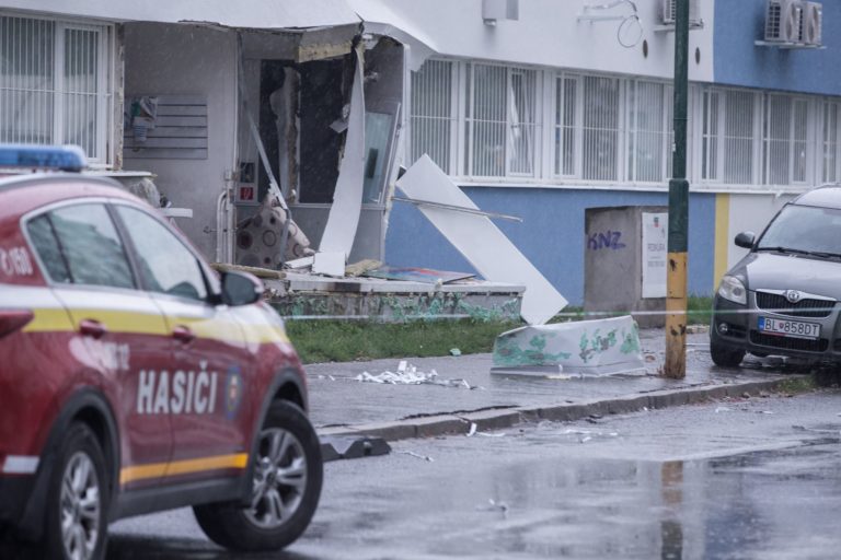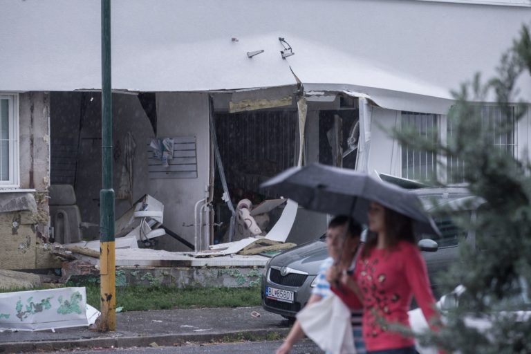 Pohľad na poškodené autá pri budove zdravotného strediska na Bebravskej ulici po výbuchu, ktorý dnes okolo 05:00 poškodil prevádzku pedikúry v bratislavskej Vrakuni. Bratislava, 23. júl 2018. Foto: SITA/Branislav Bibel