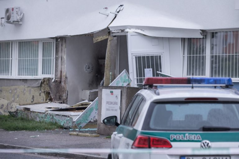 Príslušníci Policajného zboru (PZ) pri budove zdravotného strediska na Bebravskej ulici po výbuchu, ktorý dnes okolo 05:00 poškodil prevádzku pedikúry v bratislavskej Vrakuni. Bratislava, 23. júl 2018. Foto: SITA/Branislav Bibel