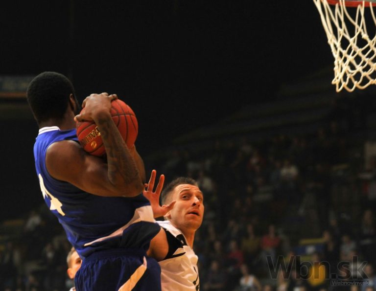 Carlos Smith (vľavo) z výberu Východu a Siniša Bilič zo Západu počas Zápasu hviezd Slovenskej basketbalovej ligy mužov. Bratislava, 13. december 2014. Foto: SITA/Ján Slovák