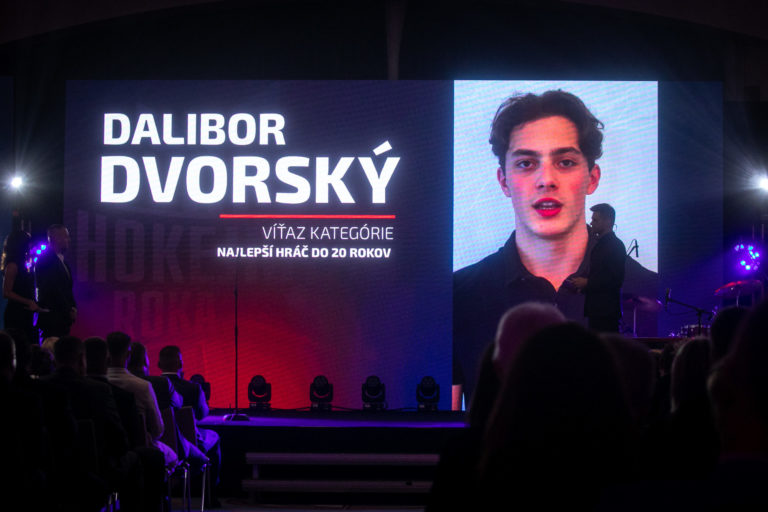 Víťaz kategórie najlepší hokejista do 20 rokov Dalibor Dvorský (na obrazovke) počas vyhlásenia ankety Hokejista roka 2023 v hoteli DoubleTree by Hilton v Bratislave. Bratislava, 9. august 2023. Foto: SITA/Diana Černak