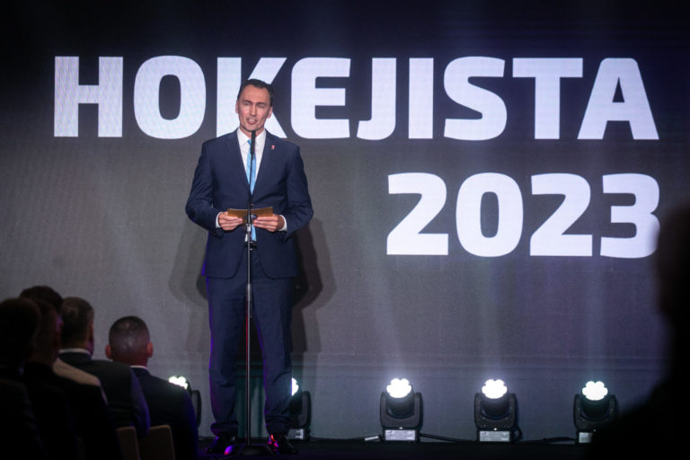 Víťaz kategórie najlepší obranca Martin Fehérváry počas vyhlásenia ankety Hokejista roka 2023 v hoteli DoubleTree by Hilton v Bratislave. Bratislava, 9. august 2023. Foto: SITA/Diana Černak