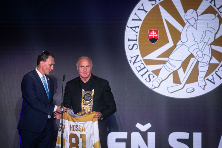 Zľava: Prezident Slovenského zväzu ľadového hokeja Miroslav Šatan a otec František Hossa st. prebral cenu a zaradenie svojho syna Mariána Hossu do Siene slávy slovenského hokeja počas vyhlásenia ankety Hokejista roka 2023 v hoteli DoubleTree by Hilton v Bratislave. Bratislava, 9. august 2023. Foto: SITA/Diana Černak