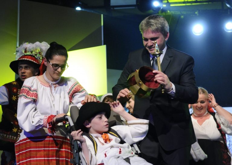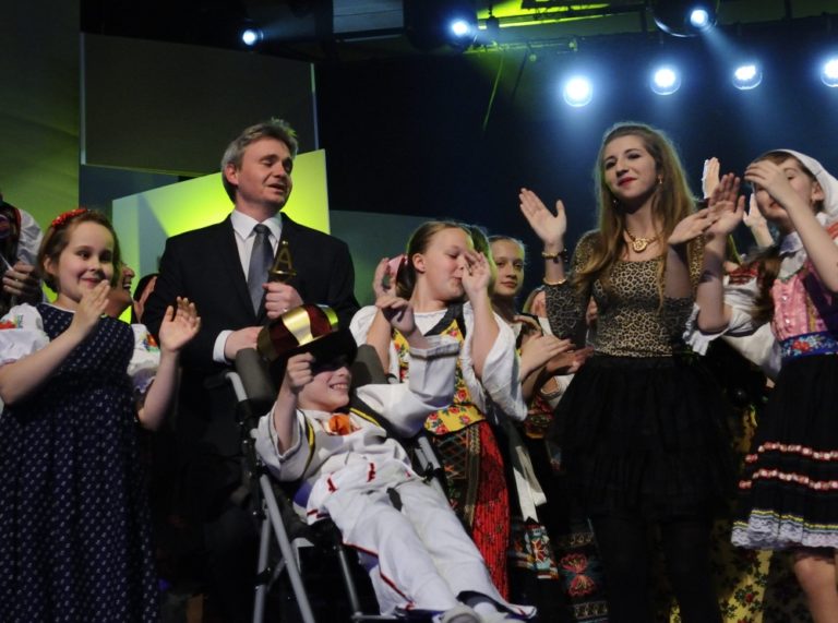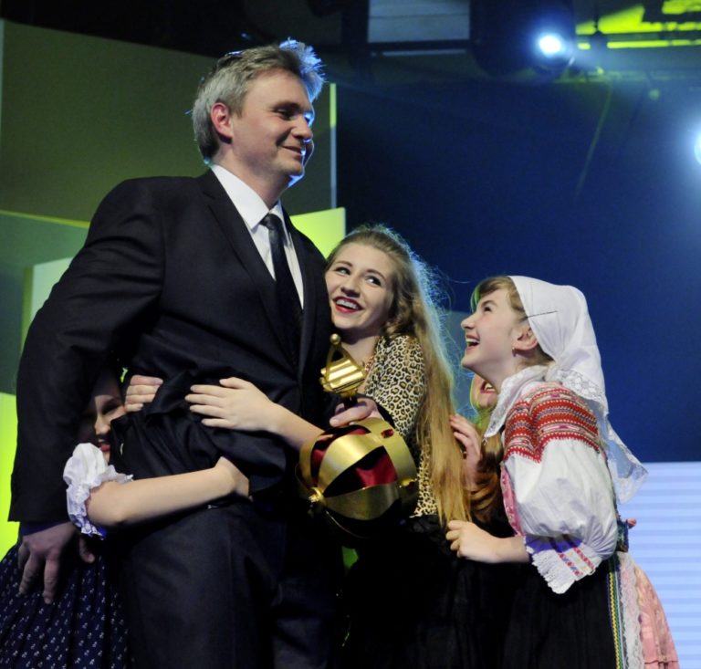 Víťaz finálového kola Pavol Leško (uprostred) zo Spojenej školy Dominika Tatarku v Poprade počas ankety o najobľúbenejšieho učiteľa a učiteľku na Slovensku Zlatý Amos 2015. Košice, 4. máj 2015. Foto: SITA/Jozef Jarošík