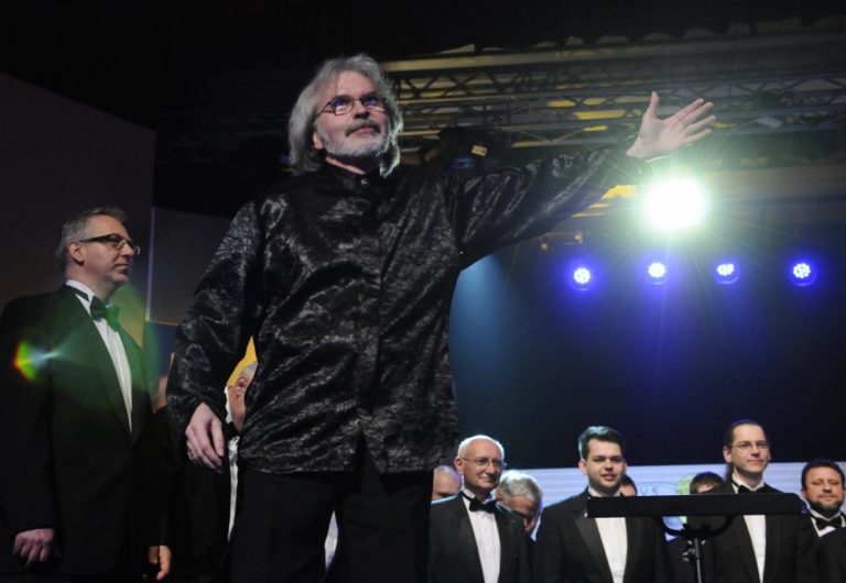 Spevácky zbor Slovenských učiteľov, súčasný dirigent Štefan Sedlický (v popredí) počas vystúpenia v rámci finálového kola ankety o najobľúbenejšieho učiteľa a učiteľku na Slovensku Zlatý Amos 2015. Košice, 4. máj 2015. Foto: SITA/Jozef Jarošík