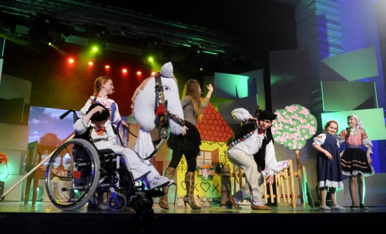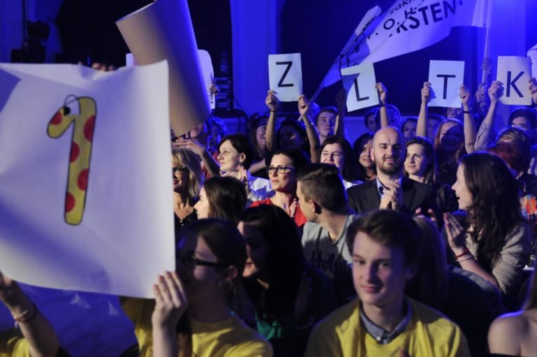 Riaditeľka ankety Renáta Vadásyová (uprostred) a diváci, žiaci prihlásených pedagógov počas finálového kola ankety o najobľúbenejšieho učiteľa a učiteľku na Slovensku Zlatý Amos 2015. Košice, 4. máj 2015. Foto: SITA/Jozef Jarošík