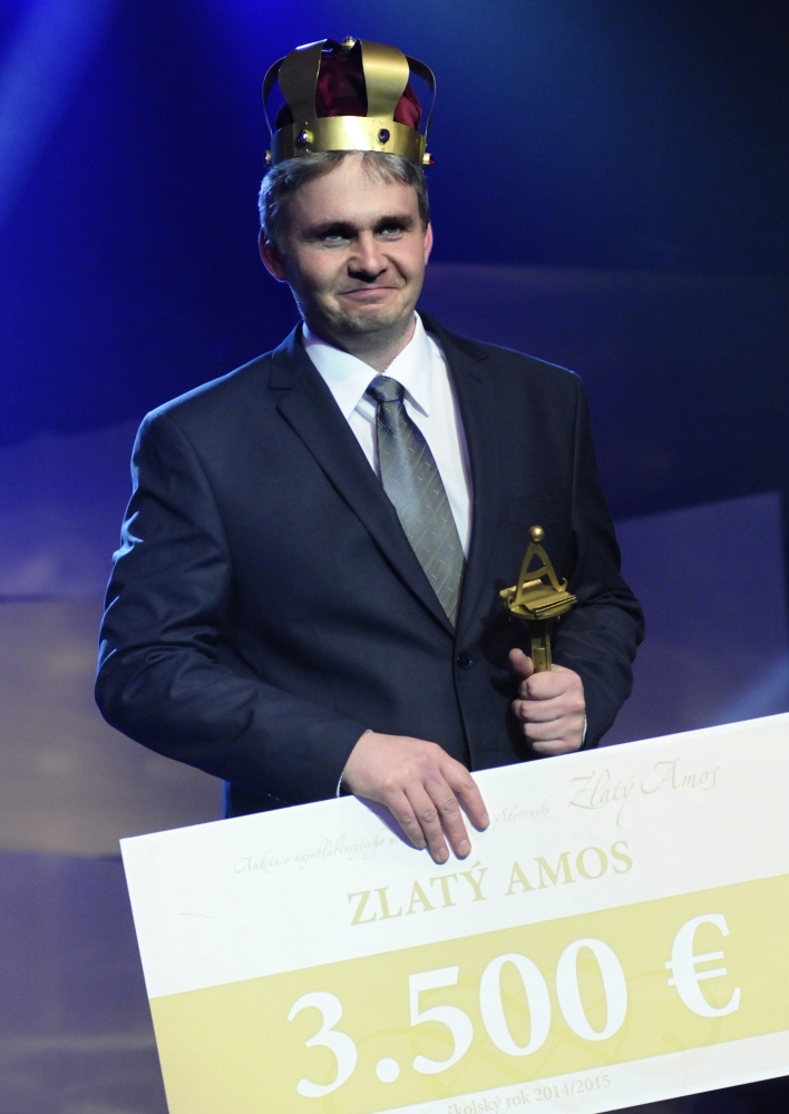 Víťaz finálového kola Pavol Leško zo Spojenej školy Dominika Tatarku v Poprade počas ankety o najobľúbenejšieho učiteľa a učiteľku na Slovensku Zlatý Amos 2015. Košice, 4. máj 2015. Foto: SITA/Jozef Jarošík