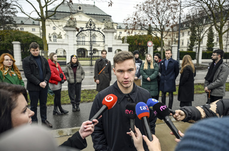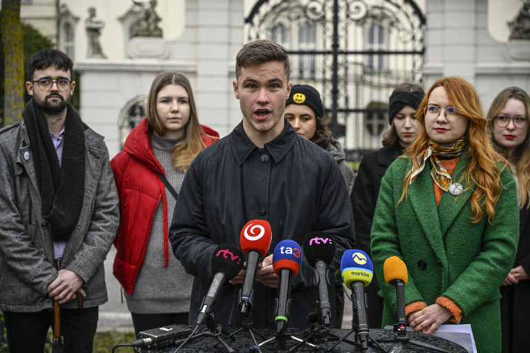 Študent Právnickej fakulty UK Marek Janiga (v popredí) odpovedá na otázky novinárov počas vyjadrenia Študentskej rady vysokých škôl (ŠRVŠ) a študenta Právnickej fakulty Univerzity komenského (UK) pred Úradom vlády na tému: Vyjadrenie k útoku premiéra Roberta Fica na adresu študenta, ktorý vyzval dekana Burdu na odbornú diskusiu o rušení Úradu špeciálnej prokuratúry. Bratislava, 21. december 2023. Foto: SITA/Milan Illík