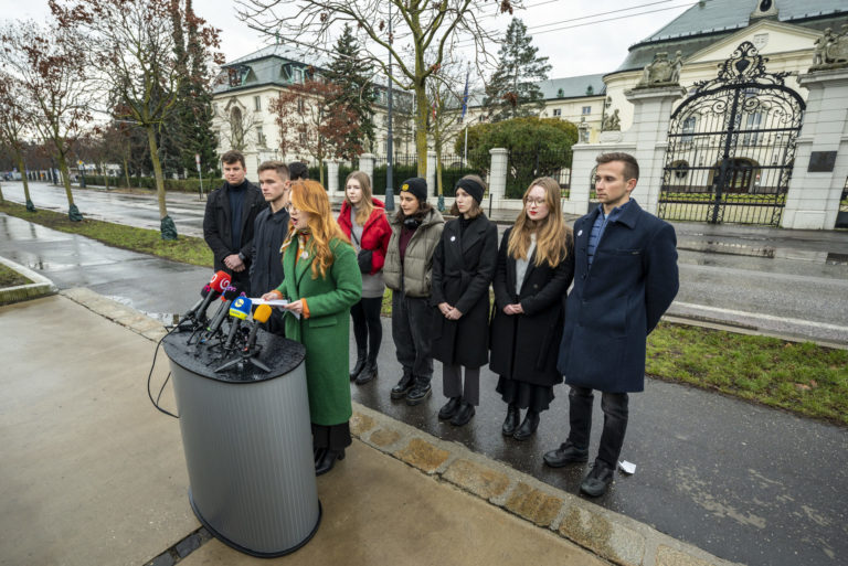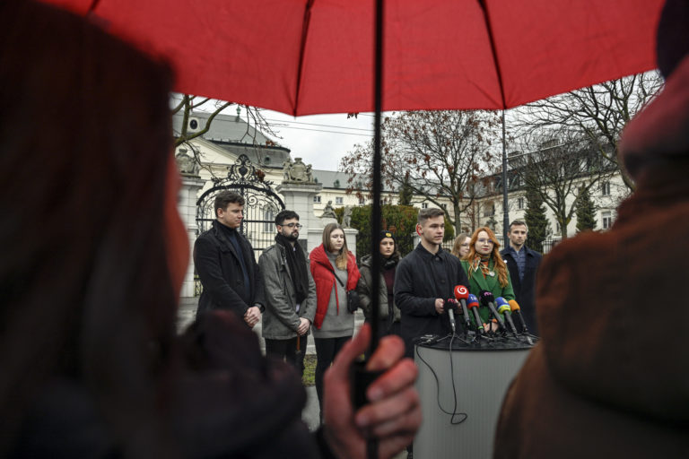 Zľava v popredí: Študent Právnickej fakulty UK Marek Janiga a predsedníčka Študentskej rady vysokých škôl Zuzana Hozlárová počas vyjadrenia Študentskej rady vysokých škôl (ŠRVŠ) a študenta Právnickej fakulty Univerzity komenského (UK) pred Úradom vlády na tému: Vyjadrenie k útoku premiéra Roberta Fica na adresu študenta, ktorý vyzval dekana Burdu na odbornú diskusiu o rušení Úradu špeciálnej prokuratúry. Bratislava, 21. december 2023. Foto: SITA/Milan Illík