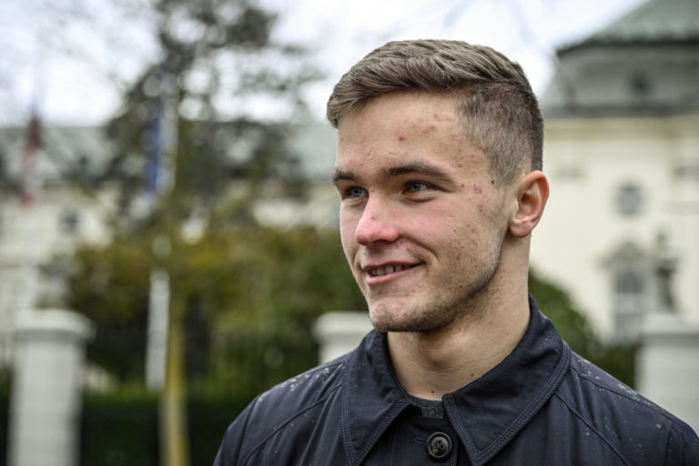Študent Právnickej fakulty UK Marek Janiga počas vyjadrenia Študentskej rady vysokých škôl (ŠRVŠ) a študenta Právnickej fakulty Univerzity komenského (UK) pred Úradom vlády na tému: Vyjadrenie k útoku premiéra Roberta Fica na adresu študenta, ktorý vyzval dekana Burdu na odbornú diskusiu o rušení Úradu špeciálnej prokuratúry. Bratislava, 21. december 2023. Foto: SITA/Milan Illík