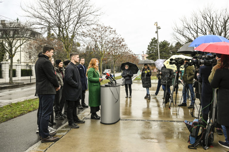 Študenti počas vyjadrenia Študentskej rady vysokých škôl (ŠRVŠ) a študenta Právnickej fakulty Univerzity komenského (UK) pred Úradom vlády na tému: Vyjadrenie k útoku premiéra Roberta Fica na adresu študenta, ktorý vyzval dekana Burdu na odbornú diskusiu o rušení Úradu špeciálnej prokuratúry. Bratislava, 21. december 2023. Foto: Archívne, SITA/Milan Illík.
