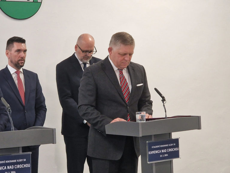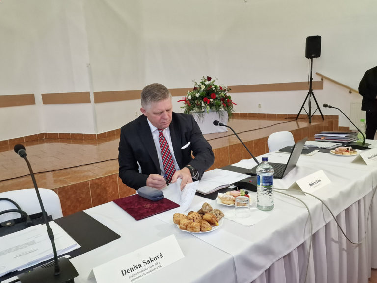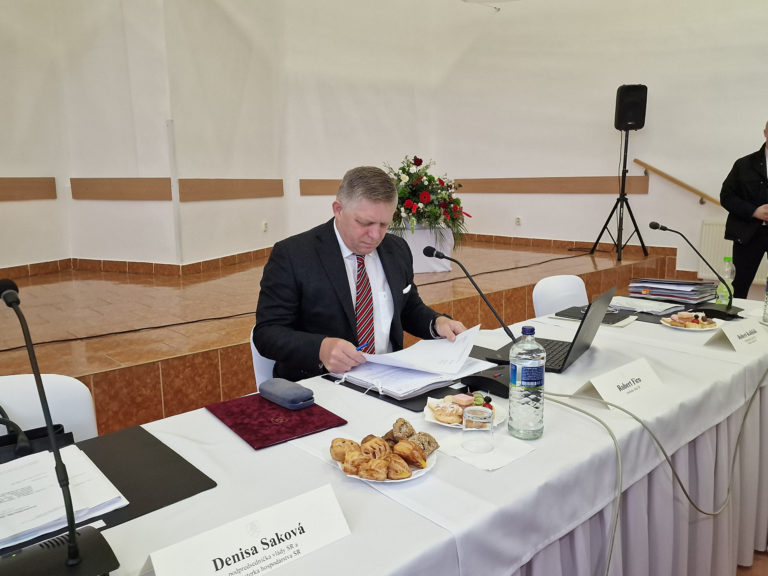 Predseda vlády SR Robert Fico počas výjazdového rokovania 13. schôdze vlády SR v priestoroch Obecného úradu v Kamenici nad Cirochou (okres Humenné). Kamenica nad Cirochou, 23. január 2024. Foto: SITA/Ivan Kriššák