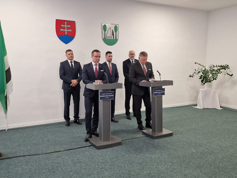 Zľava: Minister pôdohospodárstva a rozvoja vidieka SR Richard Takáč (vľavo) a predseda vlády SR Robert Fico (vpravo) počas tlačovej konferencie v rámci výjazdového rokovania 13. schôdze vlády SR v priestoroch Obecného úradu v Kamenici nad Cirochou (okres Humenné). Kamenica nad Cirochou, 23. január 2024. Foto: SITA/Ivan Kriššák
