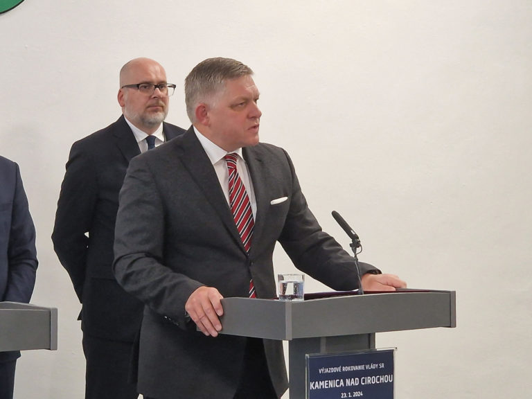 Predseda vlády SR Robert Fico (vpravo) počas tlačovej konferencie v rámci výjazdového rokovania 13. schôdze vlády SR v priestoroch Obecného úradu v Kamenici nad Cirochou (okres Humenné). Kamenica nad Cirochou, 23. január 2024. Foto: SITA/Ivan Kriššák