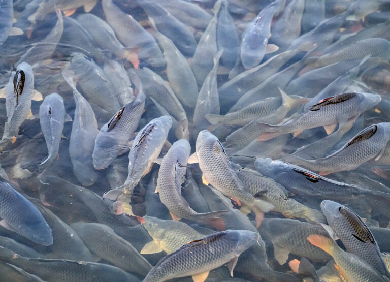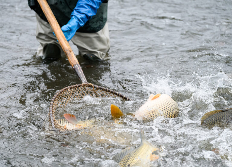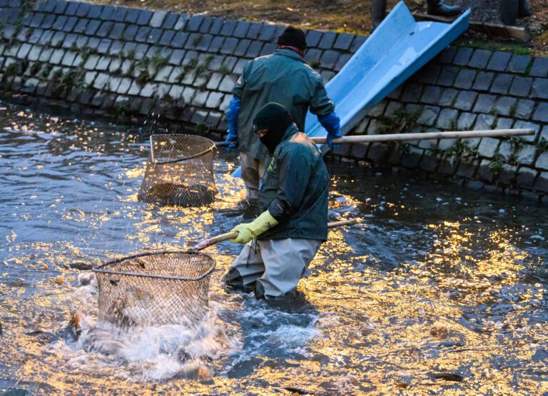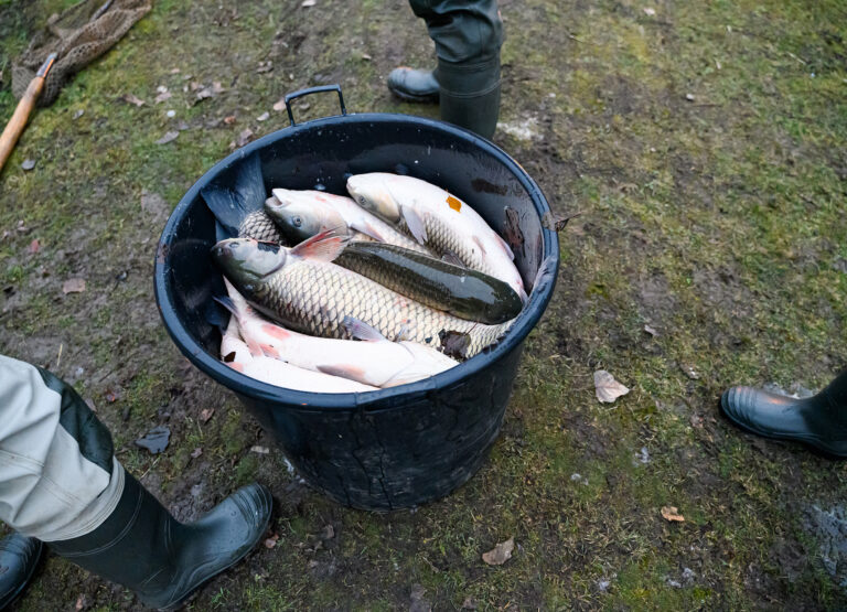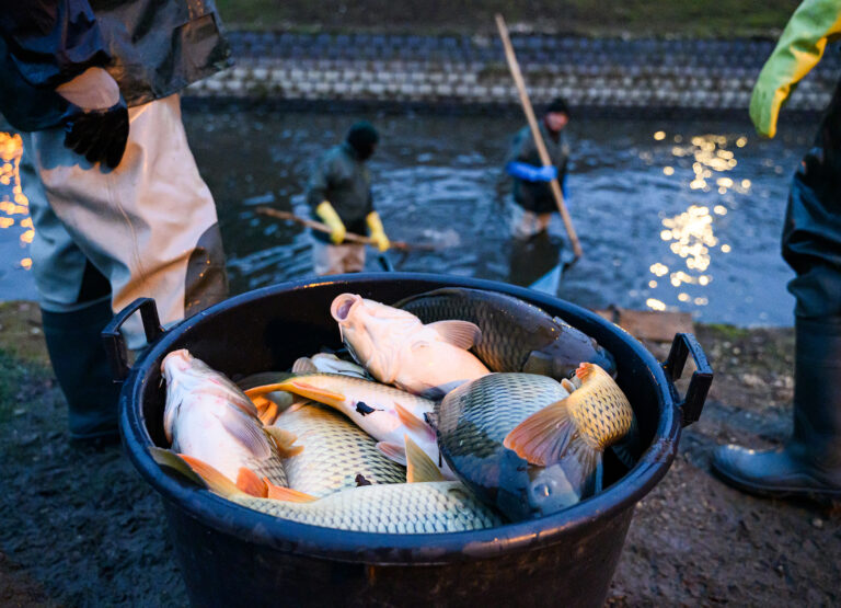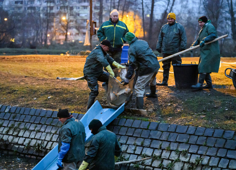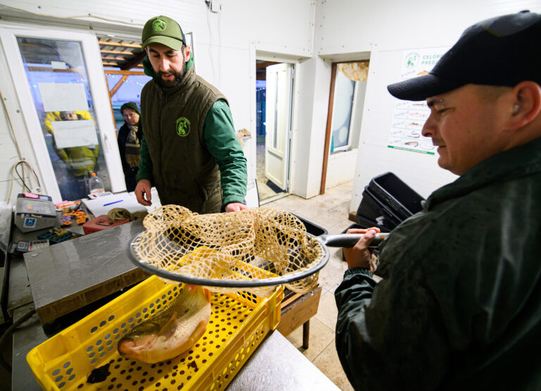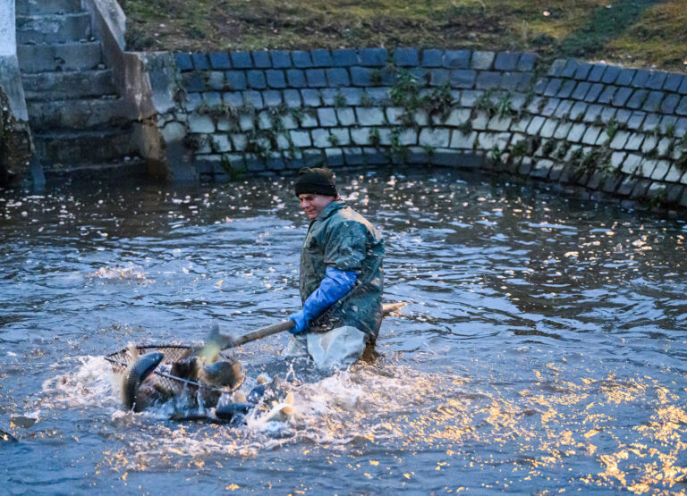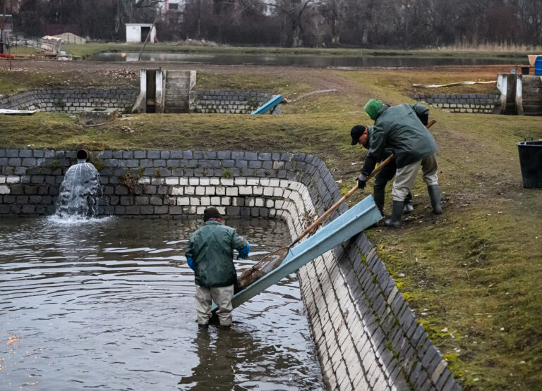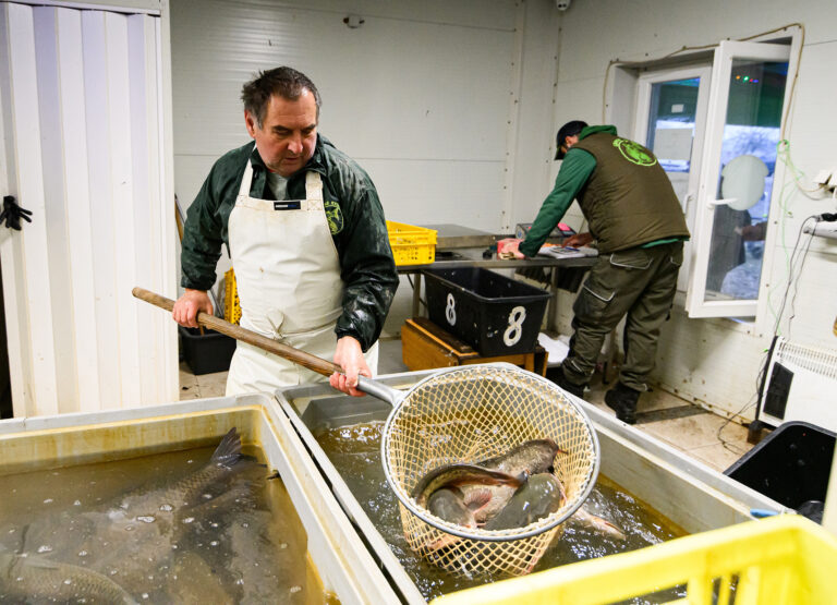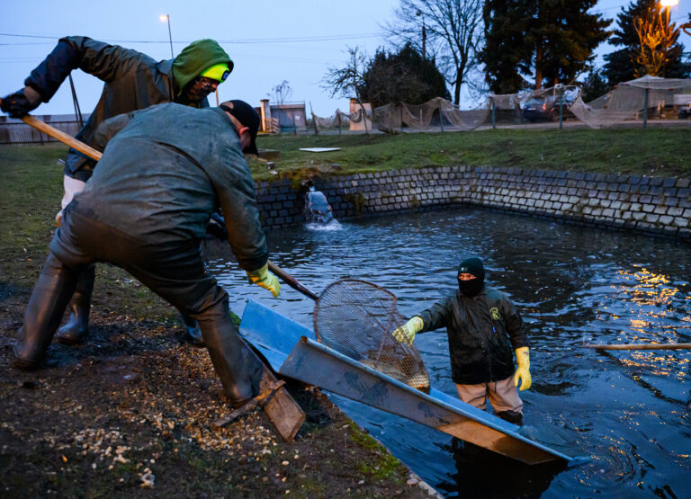 Výlov a triedenie živých rýb a predaj čerstvých rýb z levických rybníkov. Levice, 14. december 2024. Foto: SITA/Martin Havran