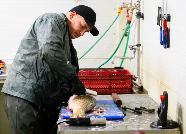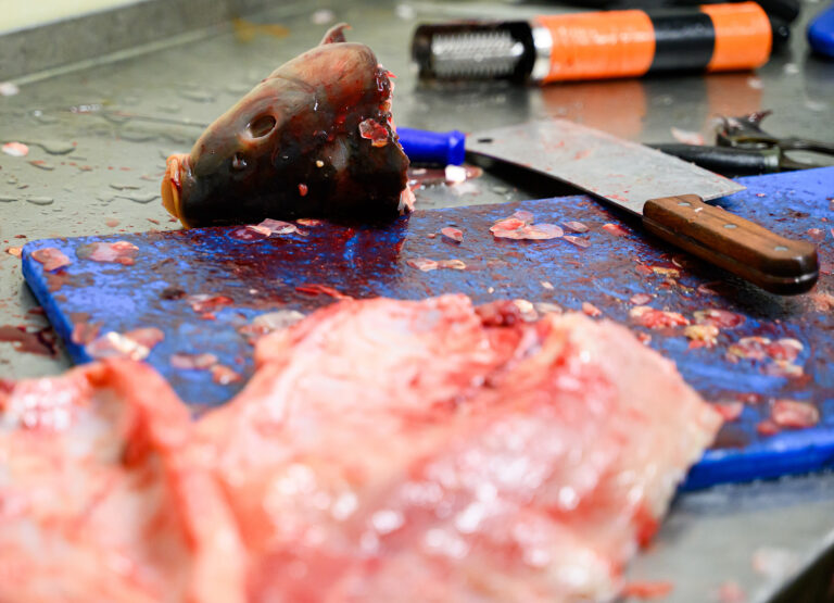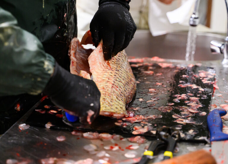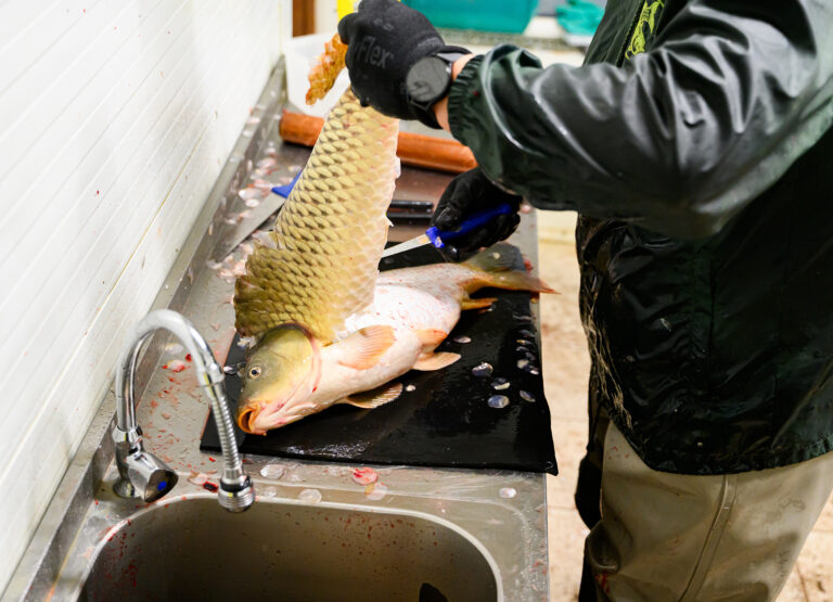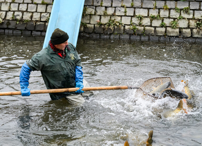 Spracovanie živých rýb pre zákazníkov počas predaj čerstvých rýb z levických rybníkov. Levice, 14. december 2024.