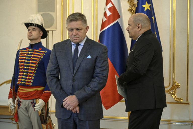 Zľava: Minister cestovného ruchu a športu Dušan Keketi a predseda vlády SR Robert Fico počas vymenovania ministra cestovného ruchu a športu v Prezidentskom paláci v Bratislave. Bratislava, 26. január 2024. Foto: SITA/Milan Illík