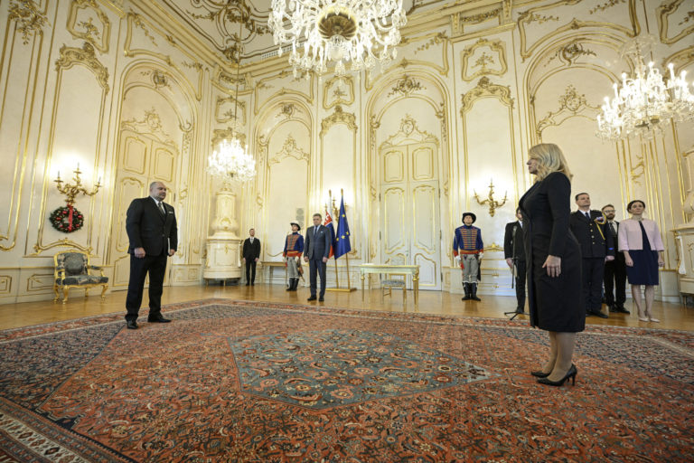 Prezidentka Zuzana Čaputová (v popredí vpravo) a minister cestovného ruchu a športu Dušan Keketi (vľavo) počas vymenovania ministra cestovného ruchu a športu v Prezidentskom paláci. Bratislava, 26. január 2024. Foto: SITA/Milan Illík