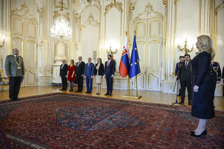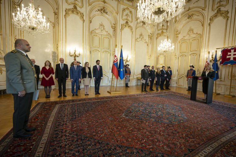 Prezidentka Zuzana Čaputová (druhá sprava) počas vymenovania nového rektora Akadémie ozbrojených síl generála M. R. Štefánika v Prezidentskom paláci. Bratislava, 18. december 2023. Foto: SITA/Milan Illík
